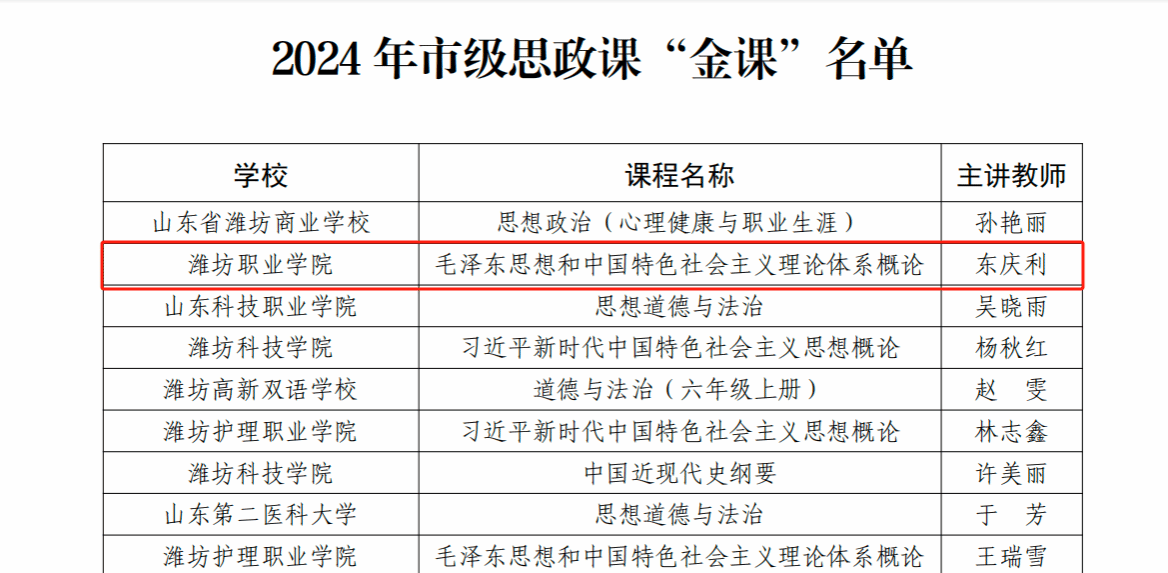 东庆利老师主讲的《毛泽东思想和中国特色社会主义理论体系概论》获评2024年市级思政课“金课”,李璐老师主讲的《习近平新时代中国特色社会主义思想概论》课程获评“十大思政精品课程”。本次荣誉的获得,不仅坚实地验证了我院教师在思政教育领域长期以来的辛勤耕耘与卓越贡献,而且充分彰显了我院在践行立德树人核心使命、积极推动“大思政”育人体系建设上所取得的突出成就与广泛认可。