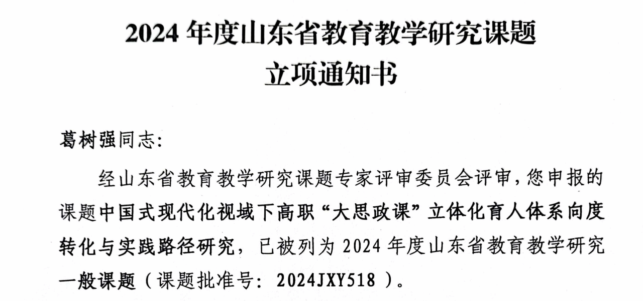 近日,2024年度山东省职业教育教学改革研究及省教育教学研究课题申报,我院三位教师课题成功立项,实现了学院课题研究领域的新突破。