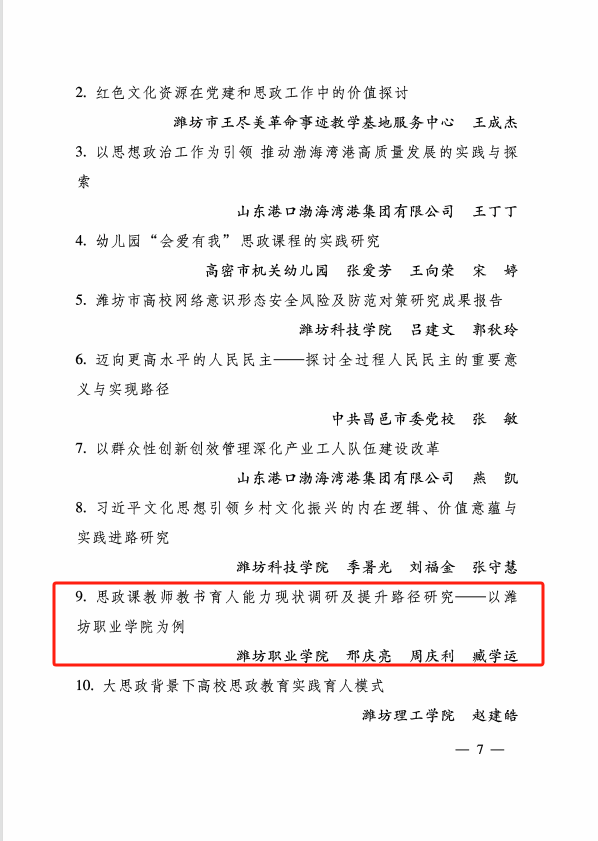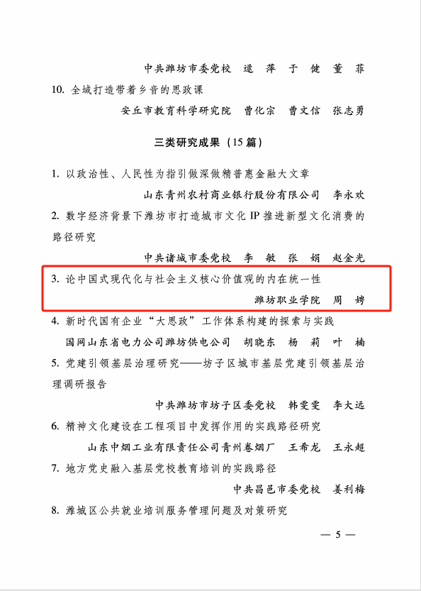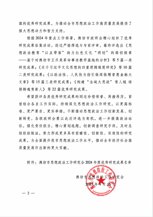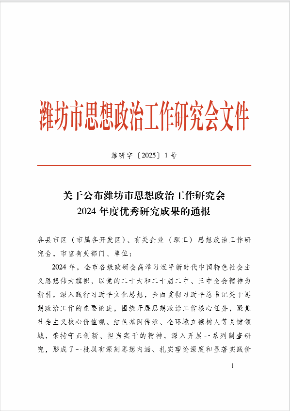 近日,潍坊市思想政治工作研究会公布了2024年度优秀研究成果评选结果,全市共评选出具有深刻思想内涵、扎实理论深度和显著实践价值的研究成果52项,我院yl6776永利集团申报的2项成果获奖。周娉老师的论文《论中国式现代化与社会主义核心价值观的内在统一性》获三类研究成果,邢庆亮教授主持的调研报告《思政课教师教书育人能力现状调研及提升路径研究 ——以6776永利集团为例》获优秀研究成果。