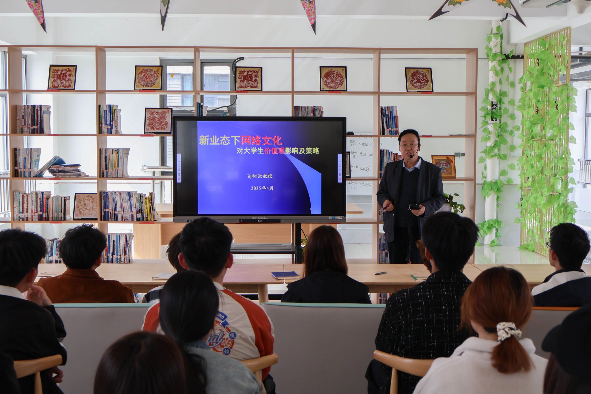 活动中,葛教授借助多媒体PPT为同学们深度剖析了新业态下网络文化对当代大学生价值观的影响及应对策略,通过展示近年来网络文化领域中具有代表性的现象案例,揭示了不良网络文化对大学生价值观产生的侵蚀风险与正向网络文化带来的积极引导作用。