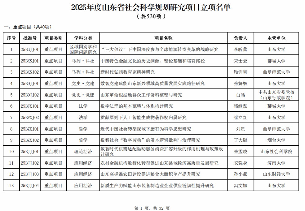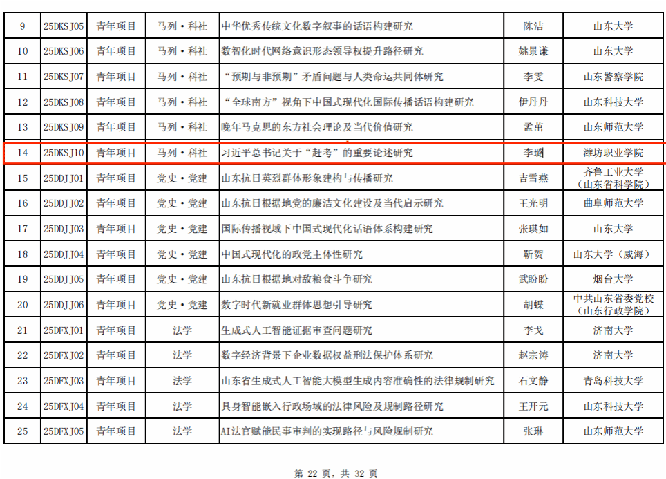 近日,山东省哲学社会科学工作办公室公布了2025年度山东省社科规划研究项目立项名单。马克思主义学院李璐老师申报的《习近平总书记关于“赶考”的重要论述研究》获批青年项目立项,全省高职院校仅获批3个项目。此次立项实现了马克思主义学院在高层次科研项目上的新突破,也展现了学院在社科研究领域的持续积淀与创新活力,为学院科研高质量发展注入新动能。