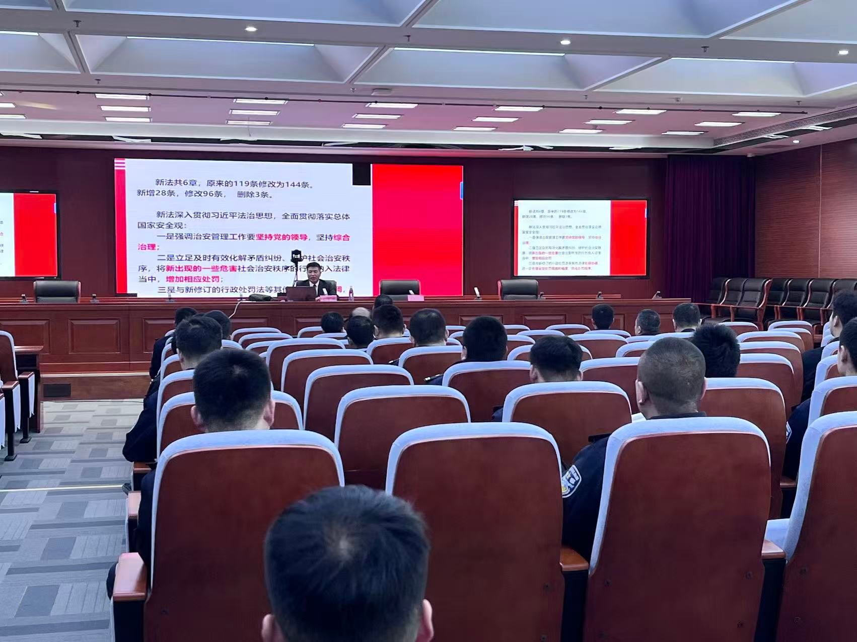 宣讲中,孙天锋凭借深厚的专业知识,紧密结合案例,讲解了新治安管理处罚法修改的背景、原则、修订要点、《治安管理处罚法》新旧条款对照等内容,清晰阐释了法律修订的时代必要性与现实意义。针对干警关注的执法重点难点,孙天锋聚焦法律修订的五大核心要点展开深入讲解。在新旧条款对照部分,孙天锋以表格形式直观呈现法律修订细节,并结合防港城亮证女事件等典型案例,剖析条款修订背后的法治精神,帮助干警精准把握法律适用尺度。培训过程中,干警们认真记录、积极互动,现场氛围热烈,培训效果显著。