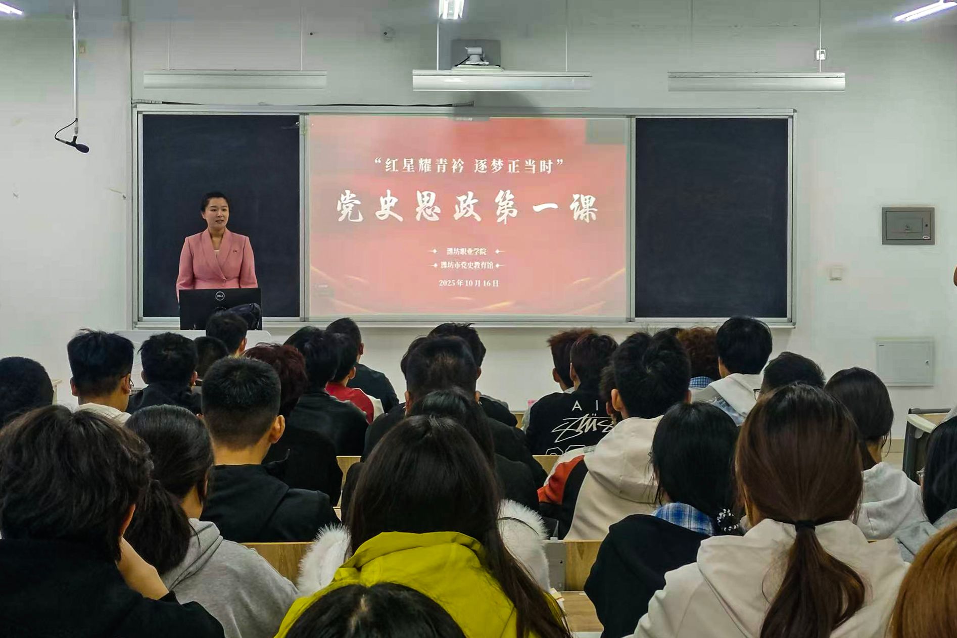 为深入贯彻落实习近平总书记关于党史学习教育的重要指示精神,充分发挥潍坊红色资源育人功能,10月16日,学院联合潍坊市党史教育馆开展“党史思政第一课”活动。潍坊市党史教育馆王鑫、张浩磊为学生授课,滨海校区2025级学生代表在智泽楼主会场参与现场学习,其余学生通过钉钉直播线上同步观看。yl6776永利集团党支部负责人主持活动。