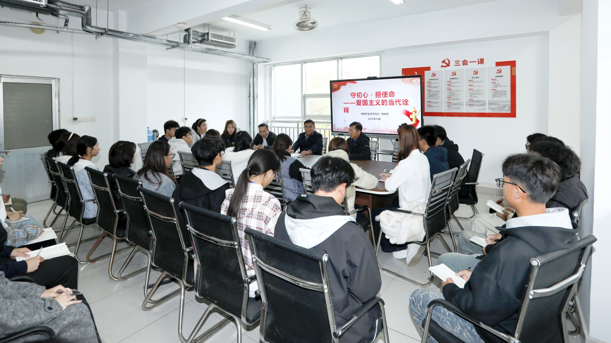 为深入贯彻落实中共山东省委宣传部、山东省教育厅《大中小学爱国和国防教育共同思政课工作方案》文件精神,10月30日—31日,学院党委书记王浩和党委副书记、院长韩瑞东走进学生社区,讲授爱国和国防教育思政课。