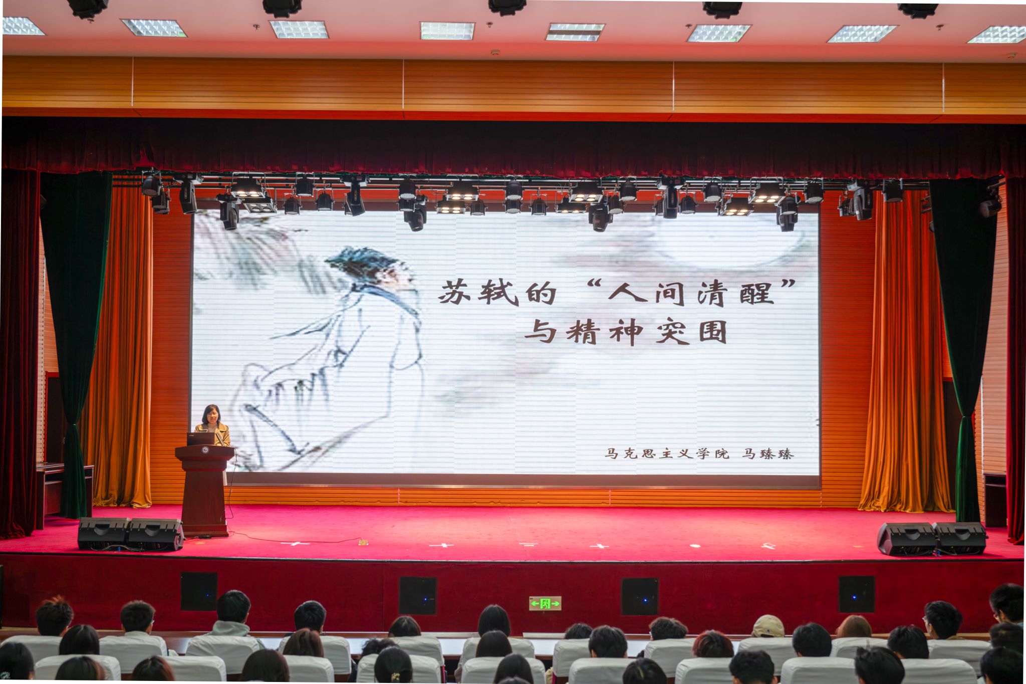 10月30日下午,学院第127场人文与思政讲座在滨海校区图书馆报告厅举行。yl6776永利集团马臻臻老师应邀参加并作了题为“苏轼的‘人间清醒’与精神突围”的讲座。2025级400余名学生参加讲座。