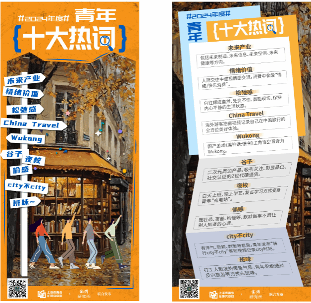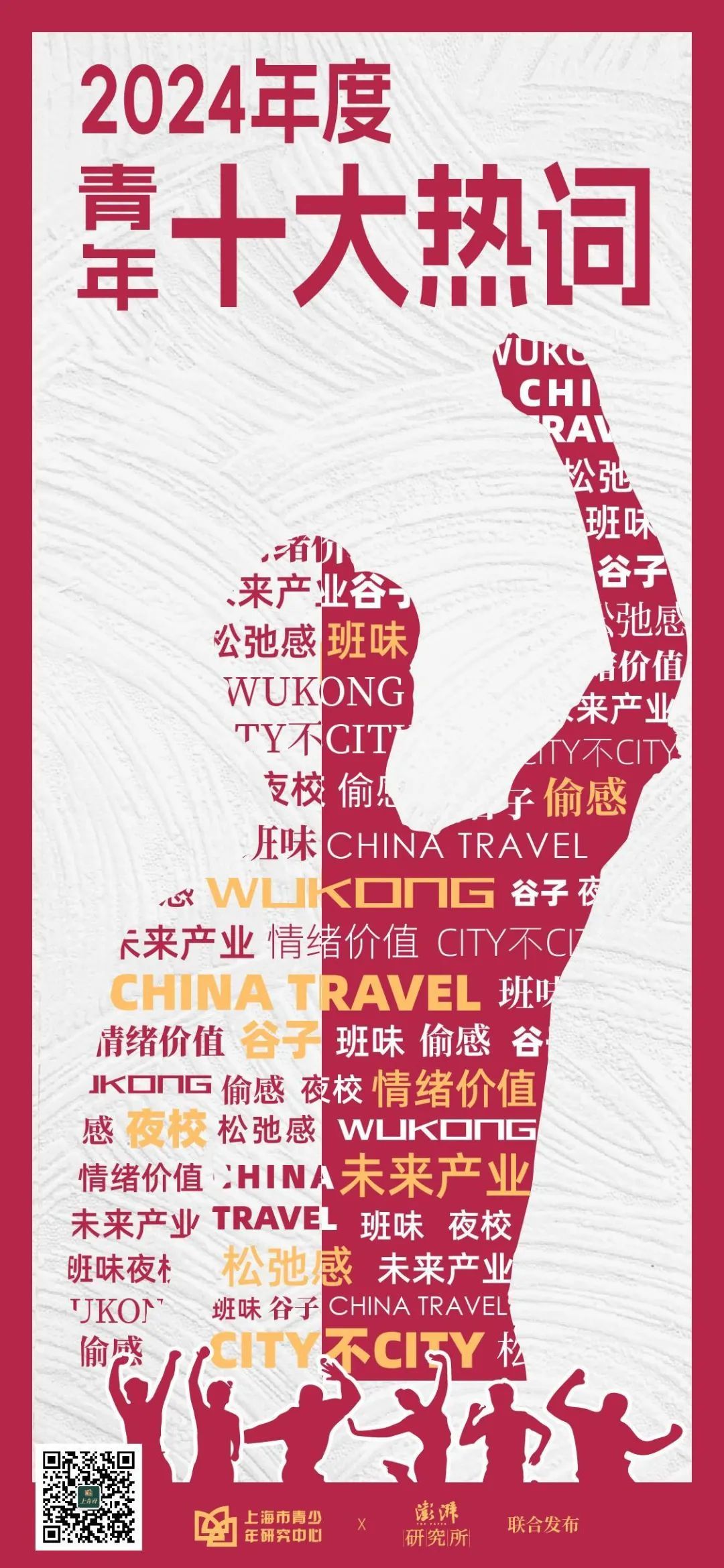 12月30日,上海市青少年研究中心、澎湃研究所联合发布2024年度“青年十大热词”。经过候选词比选、热度指数计算、专家推选和网络投票,最终形成了十大热词:未来产业、情绪价值、松弛感、China Travel、Wukong、谷子、夜校、偷感、city不city、班味。这是国内智库首次聚焦青年关注发布年度热词。